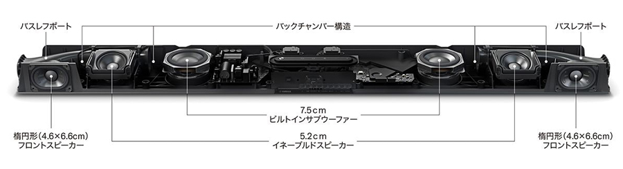 こうした音の再現を可能にするのが、ヤマハの技術やノウハウが詰まった筐体だ。コンパクトなワンボディに入る限られた数のスピーカーで、クリアな音を追求するべく、筐体内の空気の動きを最適化するバックチャンバー構造を採用した。さらに、専用に設計されたバスレフポートと楕円形スピーカーユニットにより、バランスがしっかりと取れたよい音に。音場の高さを表現するイネーブルドスピーカーにも、こだわりのチューニングが施されている。
