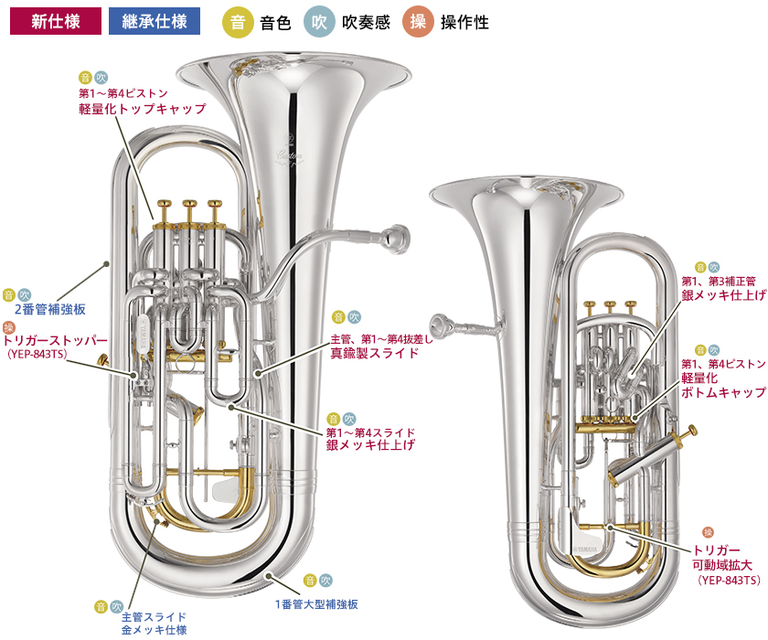ヤマハでは、1970年に発売された「YEP-321/201」を皮切りにユーフォニアムを製造し、2001年に登場したカスタムユーフォニアム「YEP-842TS」は特に銘器の誉れ高く、20年以上にわたりヤマハユーフォニアムの最上級モデルとしてプロ奏者をはじめ多くのプレイヤーに親しまれてきた。そして、今年3月には「YEP-842TS」を継承する新たなるフラグシップ「YEP-843S/YEP-843TS」が登場。