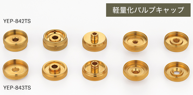 わずかな重量の差でも、楽器の吹き心地に違いが出てくる。バルブキャップが重いと、その分しっかり吹き込まないと音が返ってくる感触が得られにくいのだという。「YEP-843TS」は「YEP-842TS」と比較して、バルブキャップの高さを低くして、かつ中をギリギリまで削ることによってレスポンスの良さを獲得した(写真の左の2つはトップキャップ、右の3つはボトムキャップ)。