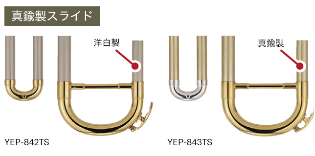 “アンサンブルに溶け込む音”というのが「YEP-843S/YEP-843TS」を開発するうえでの大きな命題だった。それを実現するために着目したのが、スライド差し込み部分の素材である。従来の洋白(ニッケルシルバー)から真鍮に変えたことで、前に出すぎない落ち着いた音色を獲得することに成功した。加えて、主管スライド以外は銀メッキ仕上げにすることで、音の輪郭がよりまろやかになり、他の楽器の音色とブレンドしやすくなったのもポイントだ。